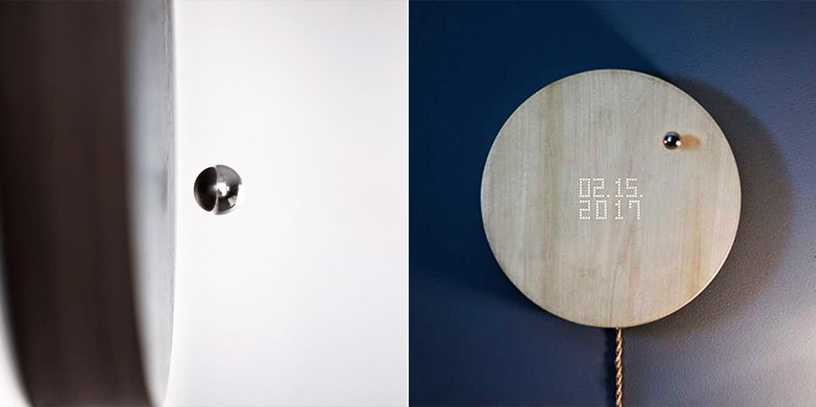 “Story”外型十分簡約,只有一塊高 42.5 毫米、直徑 268 毫米的胡桃木或白蠟?zāi)局瞥傻膱A形鐘面,以及一粒直徑 16 毫米的懸浮金屬球體。沒有任何時間刻度,也沒有指針,但懸浮的金屬球體會以運(yùn)轉(zhuǎn)的形式來標(biāo)記時間的軌跡,令人不禁聯(lián)想到宇宙中圍繞太陽公轉(zhuǎn)的星球。